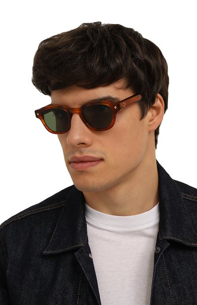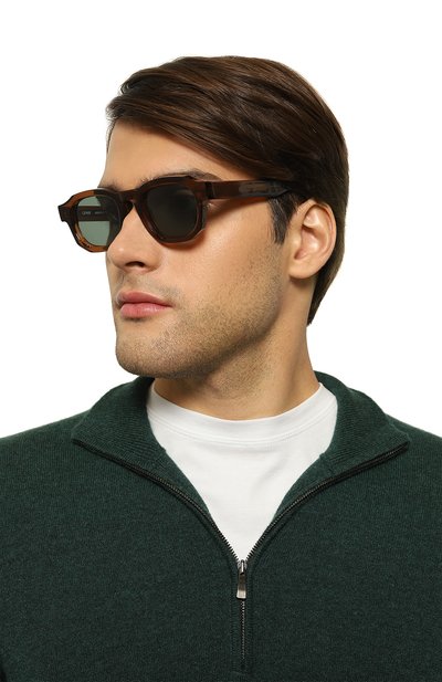 Квадратные очки вошли в лимитированную капсулу, созданную вместе с командой французской марки Officine Generale. Для изготовления широкой оправы оттенка гречишного меда использовали полупрозрачный черепаховый ацетат, отполированный до идеальной гладкости. Дужки укрепили металлическим внутренним каркасом с выгравированным узором. Однотонные зеленые линзы с антибликовым покрытием обеспечивают 100% защиты от ультрафиолетовых лучей.