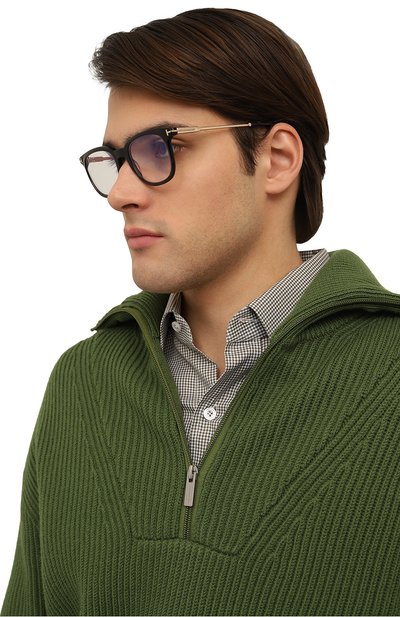 Лаконичную черную оправу изготовили из прочного ацетата, хорошо перенимающего тепло кожи. Дужки модели с брендированными деталями выполнили из легкого золотистого металла, отполированного до глянцевого блеска. Аксессуар дополнили прозрачными линзами с покрытием blue block, уменьшающими вредное воздействие на глаза от мониторов.