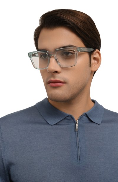 Квадратную оправу виз уально смягчили, выполнив из полупрозрачного ацетата бледно-голубого оттенка. Глянцевый материал моментально перенимает тепло кожи и почти ничего не весит. Единственным декором аксессуара стала объемная надпись Icon на дужках.