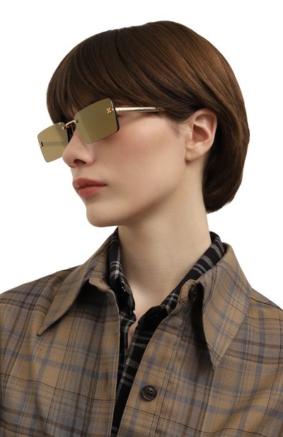 Небольшие очки с прямоугольными рамками одинаково хорошо впишутся и в мужской, и в женский образ. Для изготовления тонкой оправы использовали прочный серебристый металл, а заушники отделали теплым на ощупь ацетатом медового оттенка. Однотонные серые линзы из устойчивого к царапинам поликарбоната обеспечивают 100% защиты от ультрафиолетовых лучей. О принадлежности аксессуара бренду говорит ажурный логотип на узких дужках.