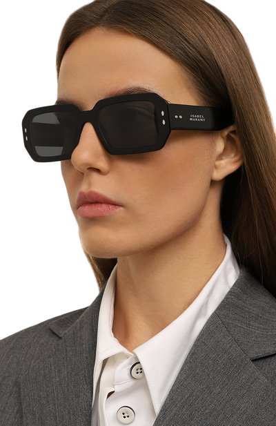 Для создания черных очков скульптурного силуэта выбрали легкий ацетат, который славится своей прочностью. Принадлежность марке обозначили максимально деликатно, расположив слева небольшой логотип. Линзы с дымчатым градиентом полностью блокируют ультрафиолет, сохраняя контрастность изображения.