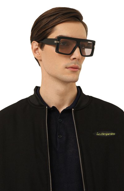 Черные солнцезащитные очки выполнили из глянцевого ацетата, который почти ничего не весит. Его блеску вторят полированные вставки на широких дужках. Крупная монолинза с паттерном в виде логотипа бренда на 100% блокирует ультрафиолет.