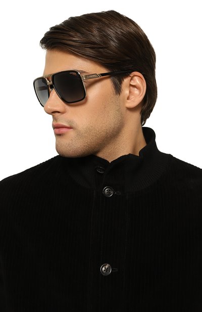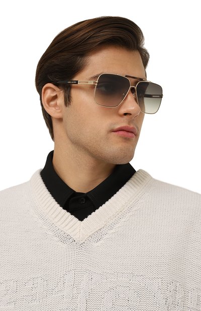 Эти солнцезащитные очки выполнили из металла и прочного ацетата черного цвета. Такая комбинация материалов сделала модель легкой, поэтому она обеспечивает комфорт даже при долгом использовании в течение дня. Аксессуар с двойным мостом дополнили синими градиентными линзами, которые на 100% блокируют вредны е UVA- и UVB-лучи, не искажая цветопередачу.