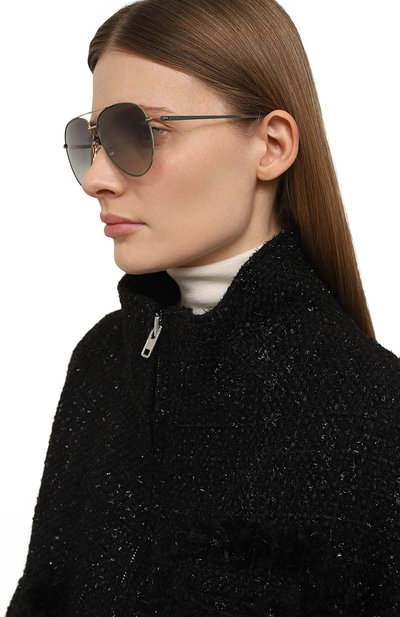 Геометричную форму зеленых линз этих солнцезащитных очков подчеркивает узкая контрастная оправа из полированной нержавеющей стали. Гладкость прочного металла оттеняет рельефный рисунок на двойном мосте и петлях, который отсылает к фирменной трехцветной полоске. С ним рифмуется тонкая линия на концах заушников из полимера с черепаховым узором.