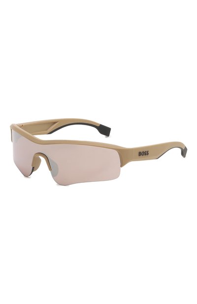 Бежевым солнцезащитным очкам придали спортивный вид монолинзой из устойчивого к царапинам нейлона, как у горнолыжной маски. Фигурную полуободковую оправу выполнили из прочного ацетата. Принадлежность марке подчеркнули рельефным логотипом, перекликающимся с черным кантом на изогнутых дужках.