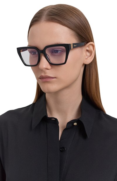 Оправу с фигурными дужками украсили вставкой в виде эмблемы и выгравированным логотипом. Для изготовления аксессуара использовали отполированный ацетат.