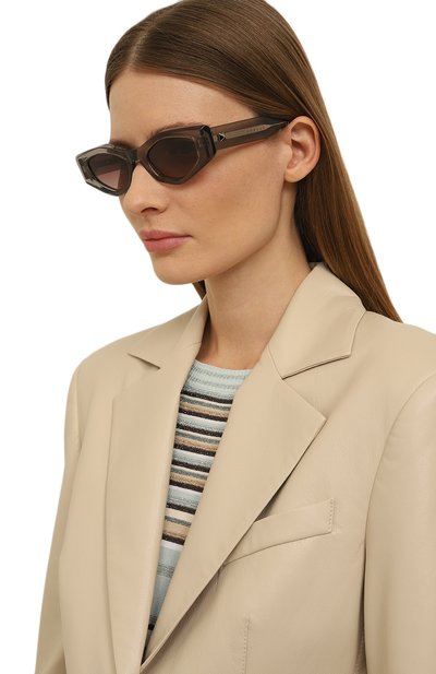 Визуально массивные серые солнцезащитные очки с коричневыми линзами почти не ощущаются на лице. Для изготовления модели с прямоугольной широкой рамкой использовали легкий ацетат, который делает конструкцию практически невесомой. Фигурные дужки дополнили миниатюрным золотистым логотипом марки.
