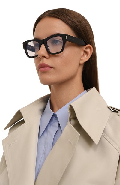 Строгий силуэт и черный цвет этой оправы позаимствовали у очков, которые носил Ив Сен-Лоран. Аксессуару придали новое звучание брендированным металлическим каркасом, который просвечивает сквозь дужки. Для изготовления модели с прямоугольными линзами использовали легкий прочный ацетат.