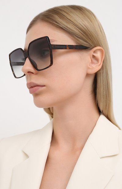 Квадратные солнцезащитные очки черепаховой расцве тки добавят образу ретронастроение. Аксессуар с широкими ободами изготовили из легкого прочного ацетата. Армированные дужки украсили выгравированным логотипом марки. Дымчатые градиентные линзы, полностью блокирующие УФ-лучи, можно заменить на корректирующие.
