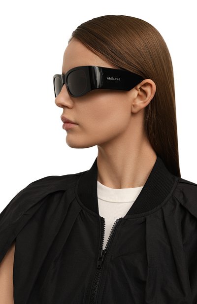 Узкие черные очки со скругленными углами изготовили из глянцевого итальянского ацетата, который сочетает в себе прочность и легкость, не деформируется и не выгорает. Широкие дужки подчеркнули металлической литерой А. Затемненные линзы из поликарбоната надежно защищают глаза, полностью блокируя ультрафиолет.