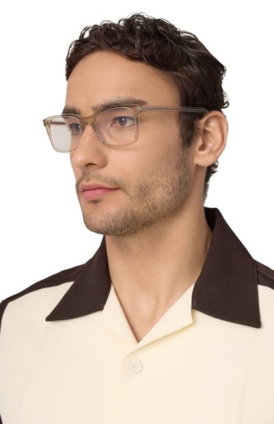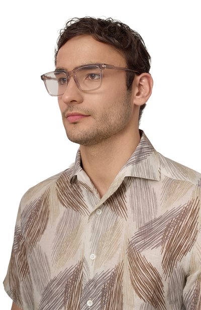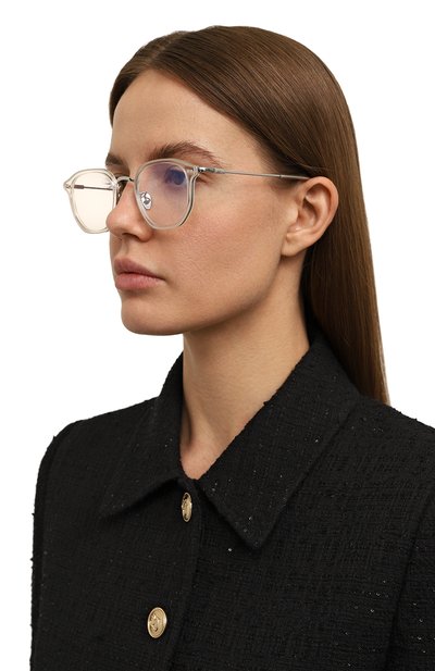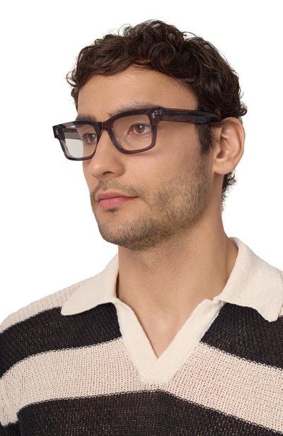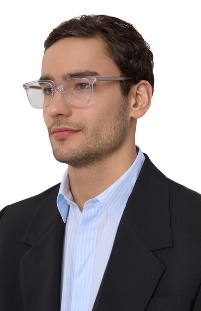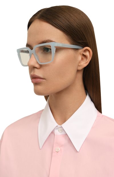 Лаконичная небесно-голубая оправа изготовлена вручную из прочного глянцевого ацетата, который не боится царапин. Широкие дужки украшены металлическими стрелками, знаковыми для бренда. Легкий однотонный аксессуар впишется как в женский, так и в мужской образ.