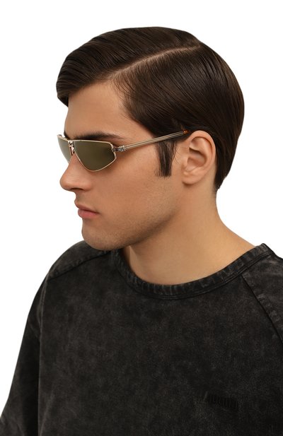 Тонкую оправу узких очков с двойным мостом выполнили из легкого прочного металла с блестящим золотистым покрытием. Модель с подвижными прозрачными носоупорами и серебристыми рельефными монограммами PA на дужках дополнили черепаховыми заушниками из теплого на ощупь полированного ацетата. Однотонные зеленые линзы обеспечивают 100% защиты от ультрафиолетовых лучей.