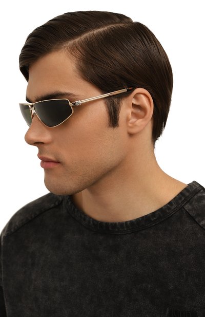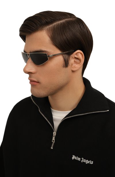Узкие очки в серебристой металлической оправе с двойным мостом словно телепортировались из 1990-х. Из того десятилетия родом обтекаемая форма и зеркальные линзы, надежно защищающие от ультрафиолета. Места крепления дужек с гравированной полосой подчеркнуты небольшой пластиной с объемной эмблемой бренда.