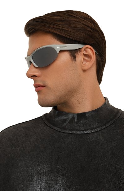 Узкие безободковые очки добавят образу спортивный акцент. Для изготовления тонкой оправы с подвижными носоупорами использовали легкий прочный металл с серебристым покрытием. Дужки дополнили дымчатыми заушниками из прозрачного ацетата, который не нагревается на солнце и не становится холодным на ощупь при низких температурах. Серые каплевидные линзы с зеркальным напылением обеспечивают 100% защиты от ультрафиолетовых лучей.