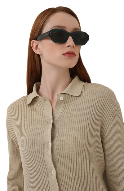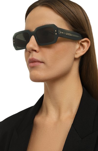 Для изготовления зеленых солнцезащитных очков с массивными прямоугольными ободами использовали легкий прочный ацетат с полупрозрачной глянцевой фактурой. Аксессуар с серыми линзами, защищающими глаза от вредного воздействия солнечных лучей, декорировали логотипом на широких дужках. Модель одинаково подходит как мужчине, так и женщине.