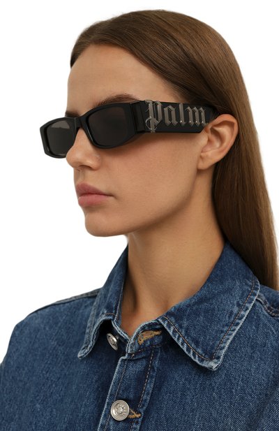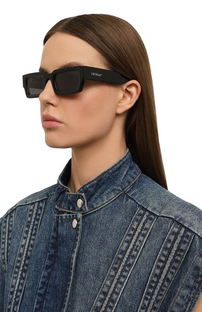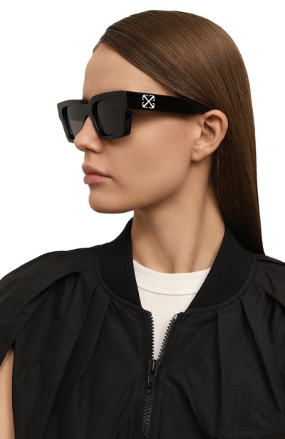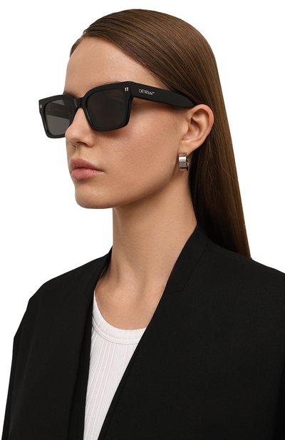 Для изготовления черных солнцезащитных очков использовали легкий прочный ацетат, отшлифованный до глянцевого блеска. Ширина прямоугольных ободов и брендированных дужек совпадает, поэтому аксессуар выглядит футуристично. Модель с серыми линзами одинаково подходит как женщине, так и мужчине.