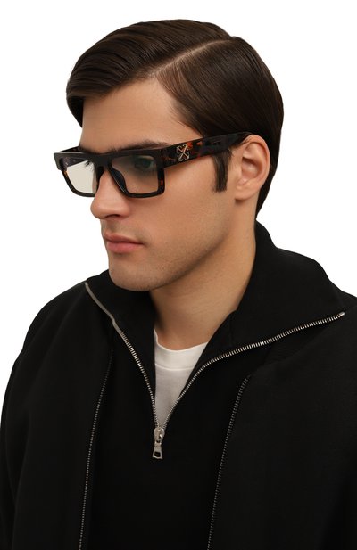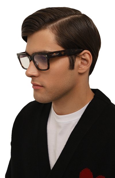 Для изготовления черепаховой оправы с квадратными рамками, подходящей и женщине, и мужчине, использовали легкий прочный ацетат, который не нагревается в жару и не становится холодным на морозе. Широкие дужки декорировали рельефными вставками в виде знаковых стрелок.