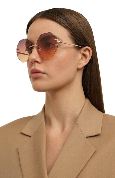 Безободковые солнцезащитные очки, представленные эксклюзивно в ЦУМе, выполнили из прочного металла, покрытого слоем позолоты. Крепления дужек украсили геометрическим узором. Модель дополнили розовыми градиентными линзами, обеспечивающими 100-процентную защиту от УФ-излучения.