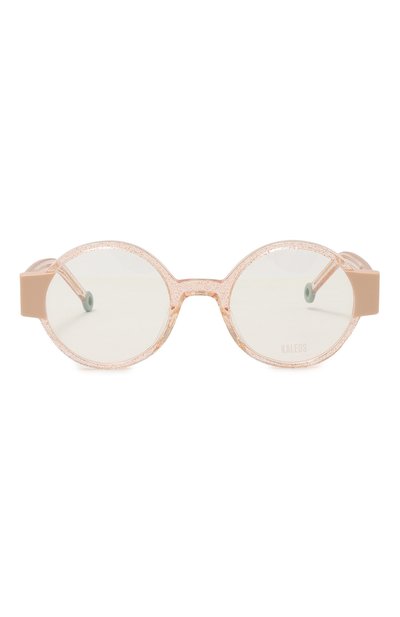 Светло-сиреневую шестиугольную оправу изготовили вручную из гладкого ацетата, который отличается особой прочностью и быстро адаптируется к температуре кожи и в холодную, и в жаркую погоду. Широкую рамку выполнили из полупрозрачного материала с блестящими вкраплениями, а узкие дужки с кольцами для цепочки — из матового.