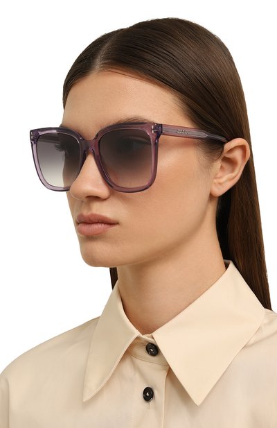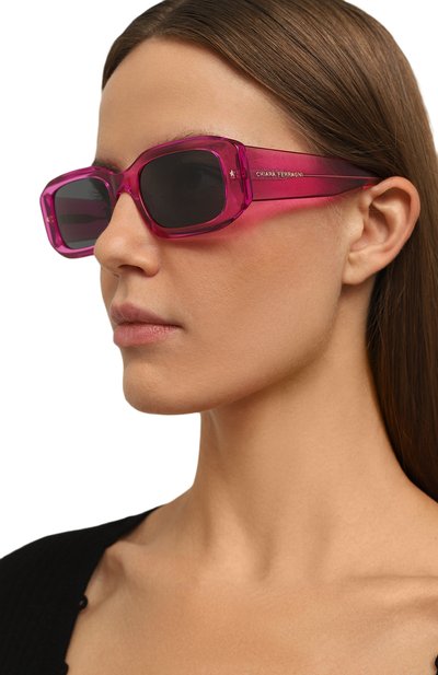 Широкую пастельно-розовую оправу этих очков выполнили из полупрозрачного ацетата, не боящегося царапин и всегда остающегося теплым на ощупь. Дужки декорировали фирменным мотивом в виде зигзага, которому вторит мятно-зеленая отделка вдоль верхнего края рамок. Однотонные серые линзы обеспечивают 100% защиты от ультрафиолетовых лучей. В комплекте – яркий съемный шнурок с эластичными петлями.