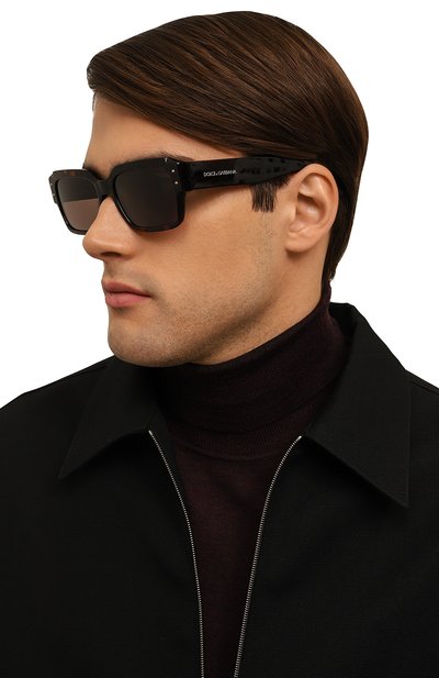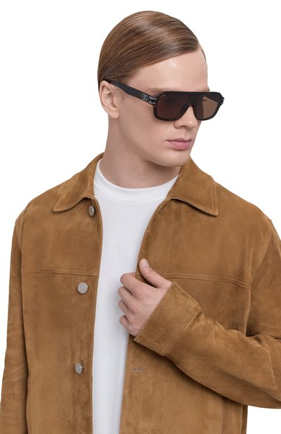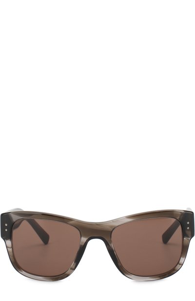 Коричневые солнцезащитные очки черепаховой расцветки выполнили из легкого прочного ацетата, который не разобьется при случайном падении. Аксессуар с коричневыми линзами из устойчивого к царапинам поликарбоната, обеспечивающего 100% защиты от ультрафиолетовых лучей, декорировали логотипом на дужках.