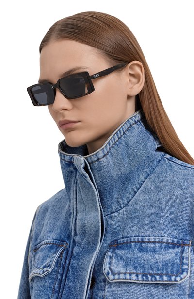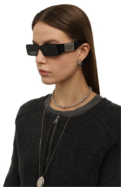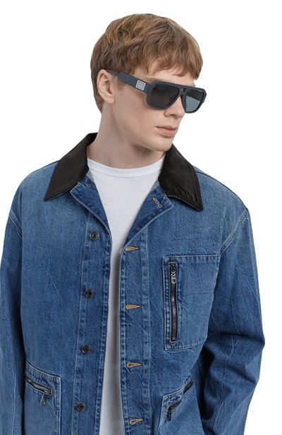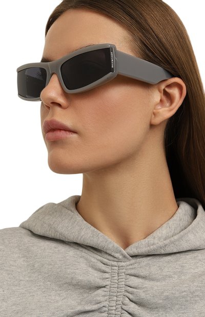 С прямоугольными рамками этих серых солнцезащитных очков перекликается серебристая брендированная пластина на широких дужках. Для изготовления аксессуара использовали легкий глянцевый ацетат. Линзы из прочного поликарбоната надежно защищают от ультрафиолета.