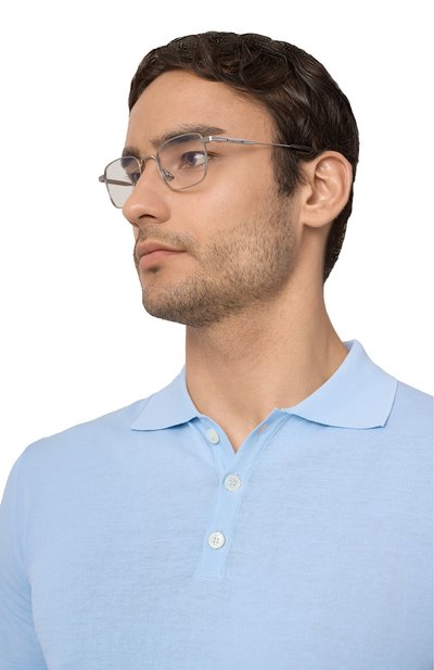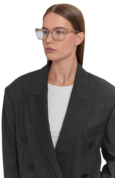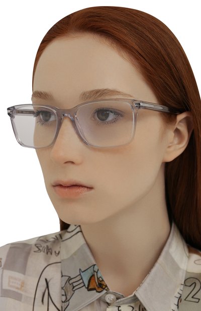Прозрачная оправа почти ничего не весит и не утяжеляет лицо. Аксессуар с прямой рамкой выполнили из легкого глянцевого ацетата, который не боится случайных падений. Широкие дужки декорировали логотипом, края квадратных ободов — миниатюрными треугольными накладками.
