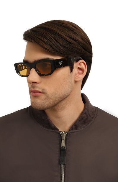 Квадратные солнцезащитные очки подойдут и женщине, и мужчине. Аксессуар из черепахового ацетата оснастили светлыми линзами, блокирующими ультрафиолет. В фигурных дужках с логотипом читается силуэт знакового для Дома треугольника.
