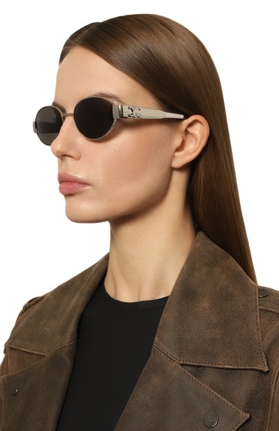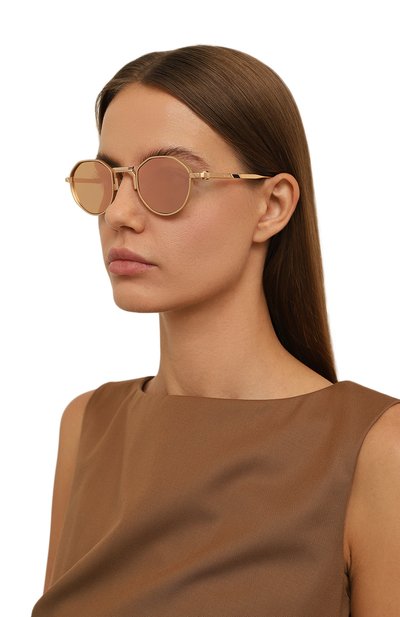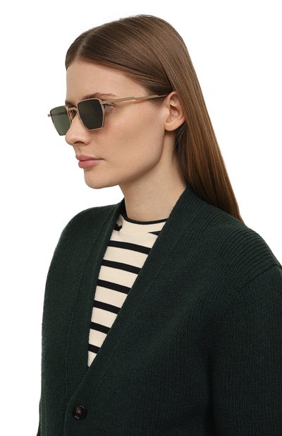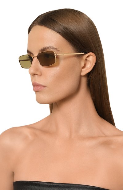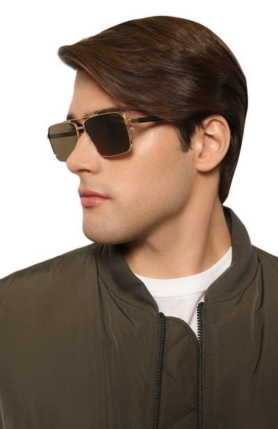Прямоугольные очки изготовили из прочного ювелирного сплава, который покрыли золотистым финишем. Заушники выполнили из глянцевого черного ацетата. В узких дужках заключили фирменную треугольную эмблему. Аксессуар с сильно затемненными коричневыми линзами впишется и в мужской, и в женский гардероб.