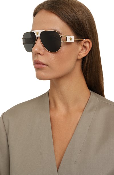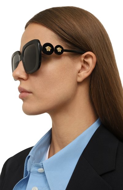 Для создания солнцезащитных очков использовали легкий ювелирный сплав с золотистым гальваническим покрытием. Черные тонкие накладки на квадратных ободах и заушники выполнили из глянцевого ацетата. Аксессуар дополнили серыми линзами, устойчивыми к царапинам и полностью блокирующими ультрафиолет. Дужки декорировали цилиндрической вставкой с барельефом головы горгоны Медузы.