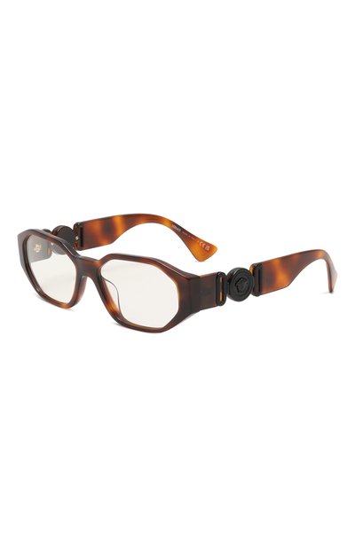 При создании коричневой оправы основной акцент сместили на широкие дужки, которые украсили скульптурными вставками в виде фирменного медальона с изображением головы горгоны Медузы. Для изготовления аксессуара с фигурной рамкой использовали легкий прочный ацетат с черепаховым мотивом.
