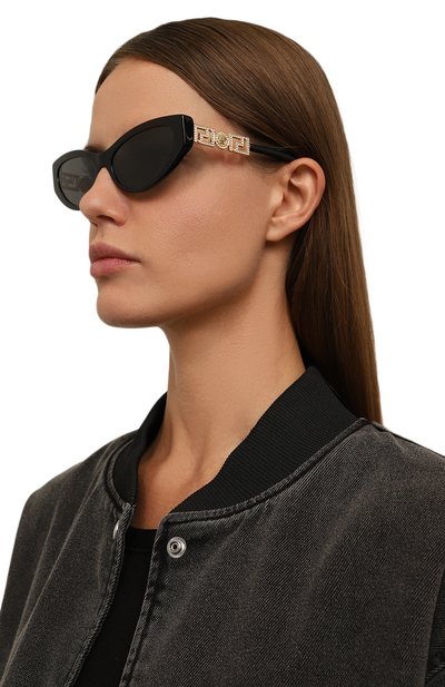 Принадлежность марке у черных солнцезащитных очков обозначили золотистыми вставками с меандровым орнаментом и изображением головы горгоны Медузы. Этими контрастными элементами дополнили широкие дужки. Модель с крупной рамкой выполнили из легкого ацетата. Линзы в тон обеспечивают 100% защиты от ультрафиолетовых лучей.