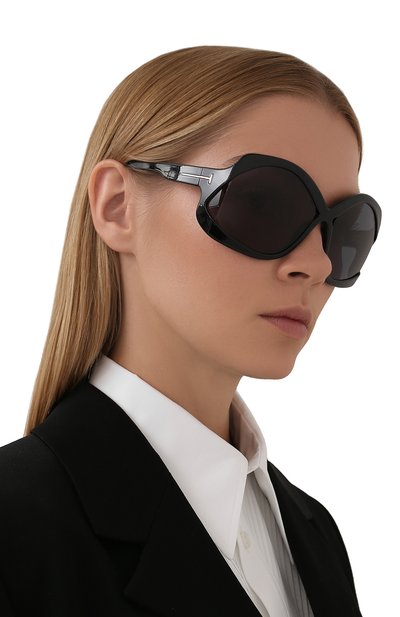 Черные солнцезащитные очки с плоскими линзами не пропускают 100% ультрафиолетовых лучей, не утомляют глаза и отражают блики. Легкая оправа со скошенными краями изготовлена вручную из гладкого глянцевого ацетата. Крепления дужек выполнены в виде знаковых для марки литер Т.