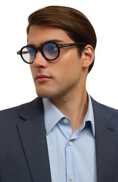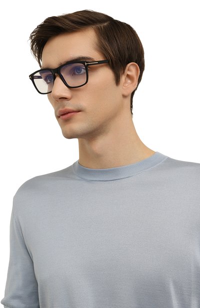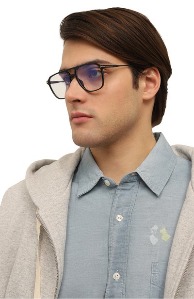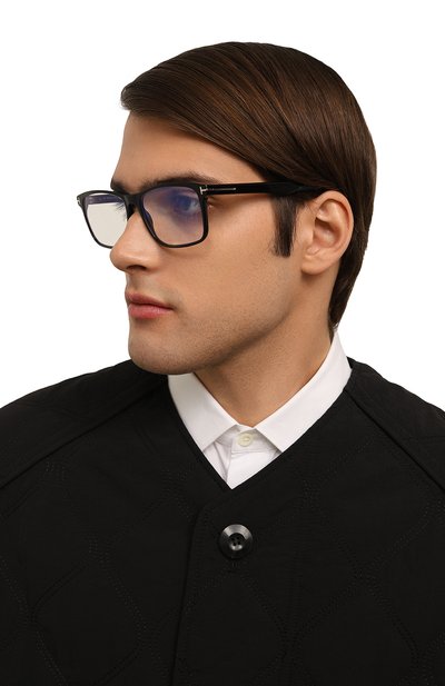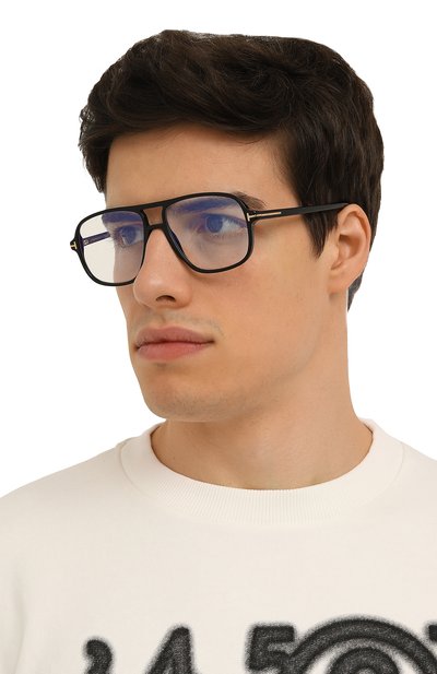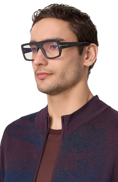 Для изготовления черной оправы с широким мостом использовали прочный гладкий ацетат. Такой материал не утяжеляет аксессуар, поэтому модель обеспечит удобство и во время долгого использования. Роль декора отдали небольшим креплениям, стилизованным под знаковую литеру T.