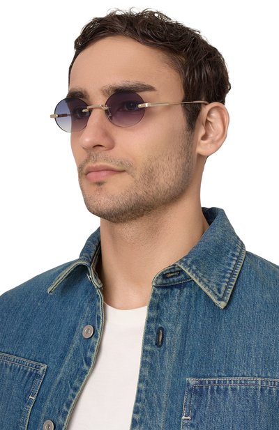 Безоправные солнцезащитные очки с голубыми градиентными линзами не пропускают 100% ультрафиолета, не утомляют глаза и гасят яркие блики. Регулируемые носоупоры, мост и узкие дужки изготовлены вручную из легкой нержавеющей стали с золотистым покрытием.