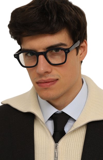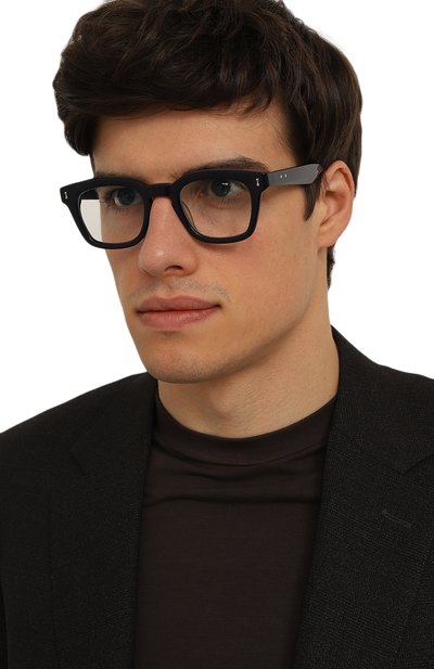 Лаконичную черную оправу, которая подойдет и женщинам, и мужчинам, выполнили из полированного прочного ацетата. Такой материал считается одним из самых легких, поэтому аксессуар почти не ощущается на лице. Рамку деликатно украсили небольшими серебристыми заклепками.