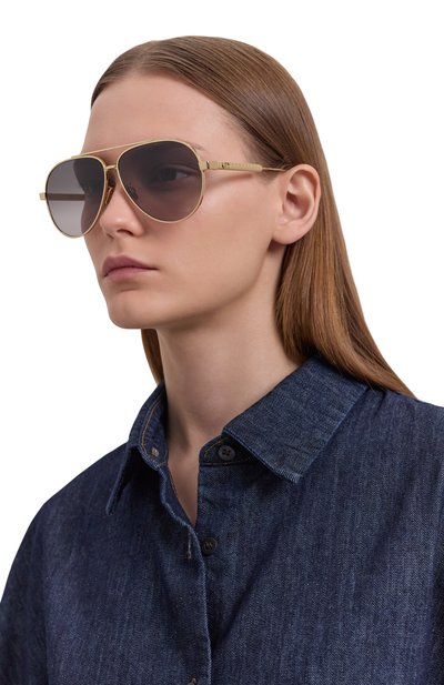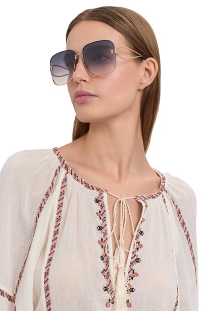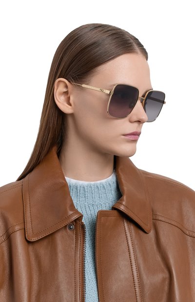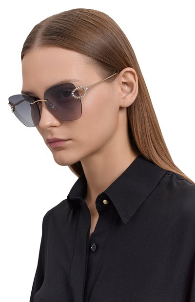 Небольшие прямоугольные очки одинаково хорошо подойдут и женщинам, и мужчинам. Для изготовления тонкой оправы использовали легкий прочный металл с блестящим золотис тым покрытием, а заушники отделали прозрачным ацетатом. Принадлежность изделия бренду подчеркнули фирменными эмалевыми треугольниками в центре ажурных фигурных дужек. Градиентные серые линзы обеспечивают 100% защиты от ультрафиолетовых лучей и в городе, и на пляже.