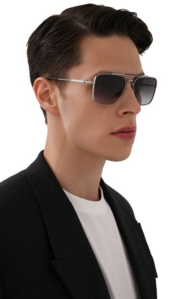 Небольшие прямоугольные очки одинаково хорошо подойдут и женщинам, и мужчинам. Для изготовления тонкой оправы использовали легкий прочный металл с блестящим золотистым покрытием, а заушн ики отделали прозрачным ацетатом. Принадлежность изделия бренду подчеркнули фирменными эмалевыми треугольниками в центре ажурных фигурных дужек. Градиентные серые линзы обеспечивают 100% защиты от ультрафиолетовых лучей и в городе, и на пляже.
