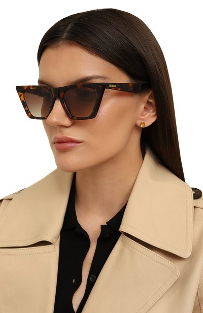 Полуободковые солнцезащитные очки 221 Hz с широкой рамкой выполнили из ультрапрочного итальянского ацетата с черепаховым мотивом. Модель дополнили дымчатыми прямоугольными линзами с фактором защиты UVA 400 и антибликовым покрытием. Дужки украсили логотипом бренда.
