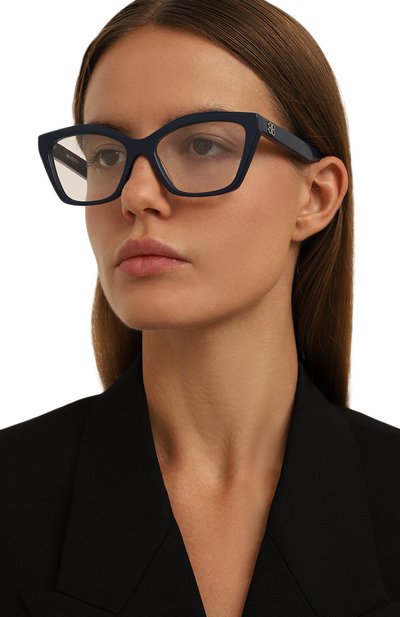 Лаконичную оправу с квадратными рамками и неподвижными носоупорами выполнили из прочного легкого ацетата на основе переработанных волокон. Широкие дужки украсили крупными серебристыми монограммами BB.