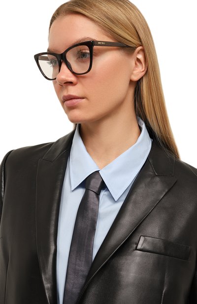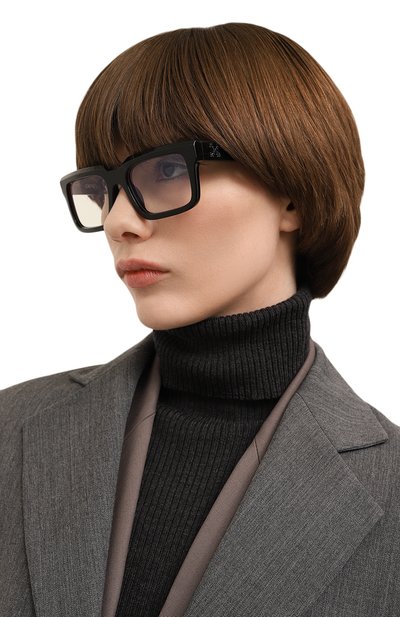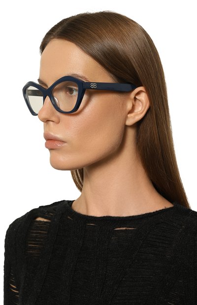 Оправу формы cat eye в ыполнили из черепахового ацетата. Левую дужку аксессуара, подходящего под образы разной степени формальности, украсили эмблемой BB.