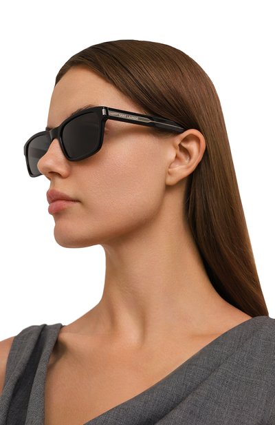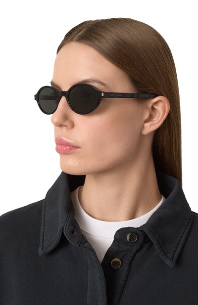 Солнцезащитные очки SL 692 с серыми тонированными линзами изготовили из металла. Аксессуар, подходящий и женщине, и мужчине, декорировали выгравированным логотипом на плоских дужках.