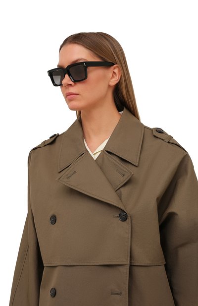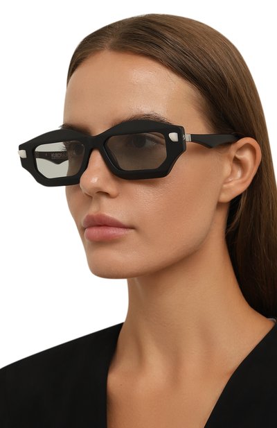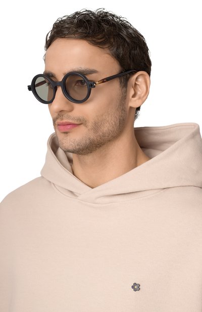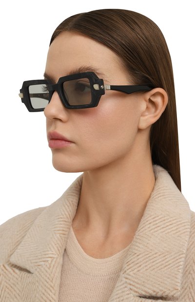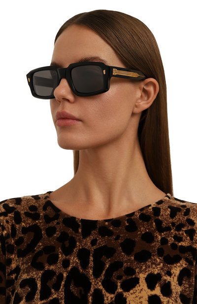 Для изготовления черных солнцезащитных очков выбрали прочный гладкий ацетат Мацукелли, выдерживающий падение с небольшой высоты. Тонкие дужки модели с фирменными петлями и яркими наконечниками закрепили с помощью серебристых деталей. Аксессуар дополнили полупрозрачными линзами из поликарбоната, блокирующими УФ-излучение.