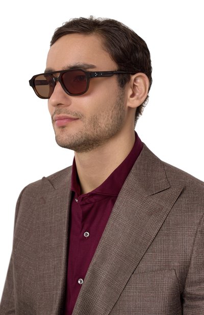 Серые линзы этих очков на 100% защищают глаза от ультрафиолета, а лаконичная оправа из ацетата с черепаховым рисунком помогает аксессуару вписываться в разные образы. Крепления фирменных широких петель создают на дужках миниатюрный контрастный узор.