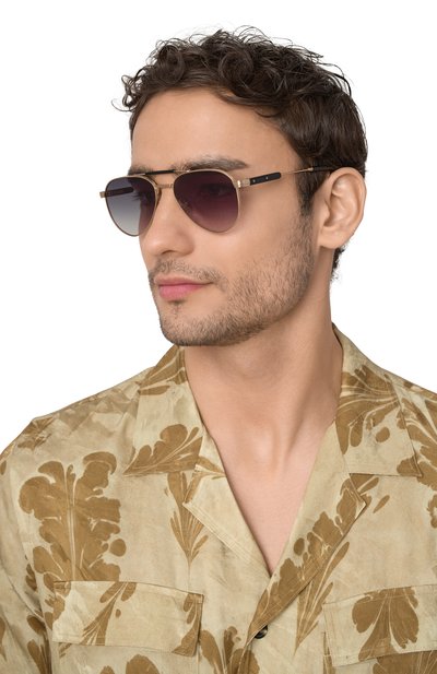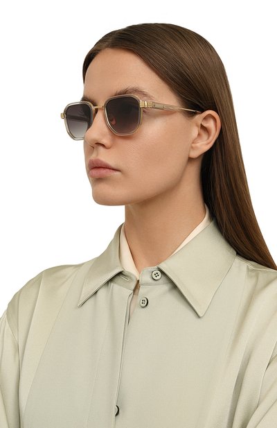 Серые солнцезащитные очки с регулируемыми носоупорами изготовили из отполированной до блеска нержавеющей стали. Дужки модели с фактурным узором прикрепили с помощью фирменных петель Barrel. Аксессуар дополнили градиентными дымчатыми линзами и поликарбоната, устойчивого к появле нию потертостей и царапин.