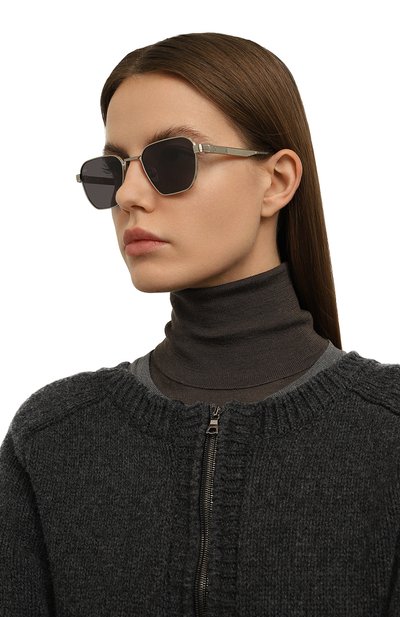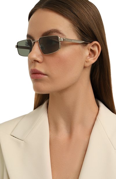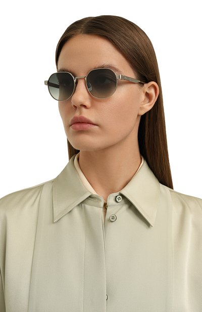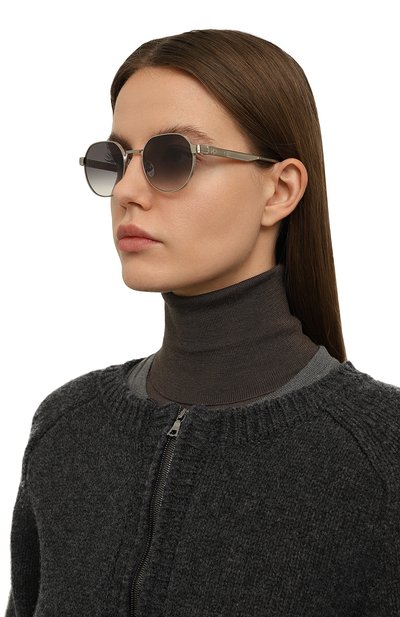 Для изготовления серебристой оправы солнцезащитных очков японские мастера использовали прочную и гибкую нержавеющую сталь. С круглыми рамками контрастирует угловатый мост. Узкие дужки подчеркнули фирменным геометрическим мотивом. Аксессуар дополнили затемненными линзами, которые гасят блики и полностью блокируют ультрафиолет.