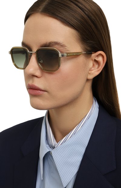 Солнцезащитные очки с серыми градиентными линзами изготовили из металла с золотистым покрытием и полупрозрачного ацетата. Дужки с деликатным выгравированным узором крепятся к рамке тремя миниатюрными петлями. Такой аксессуар подходит и женщине, и мужчине.
