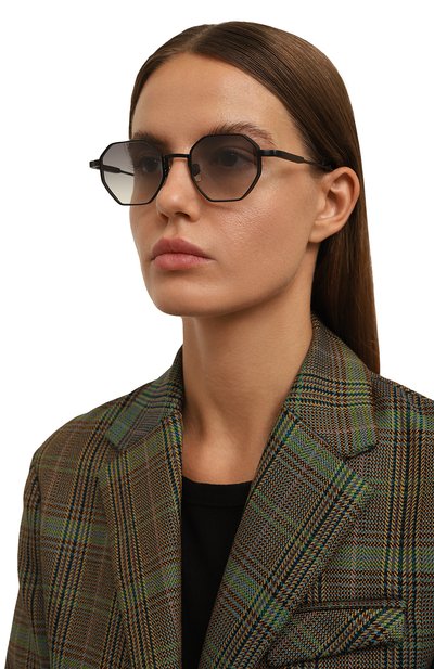 Безободковые очки изготовили из легкого и гибкого металла. Узкие дужки с рельефным узором переходят в заушники из прозрачного ацетата. Восьмиугольные линзы из устойчивого к царапинам поликарбоната обеспечивают третью степень защиты от ультрафиолета, что делает модель подходящей для отдыха на море.