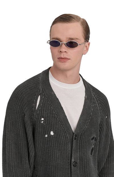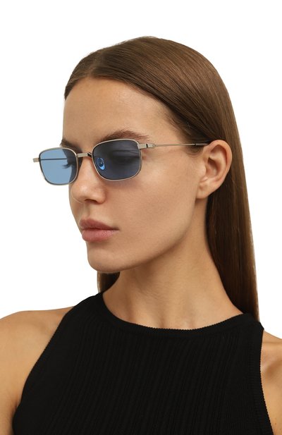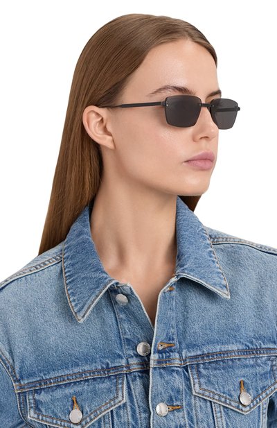 Для изготовления тонкой полуободковой оправы небольших очков использовали легкий ультрапрочный титан с черным полуматовым покрытием, а дужки выполнили из теплого на ощупь гладкого ацетата. Синие однотонные линзы обеспечивают 100% защиты от ультрафиолетовых лучей. Лаконичная модель одинаково хорошо будет смотреться и на женском, и на мужском лице.