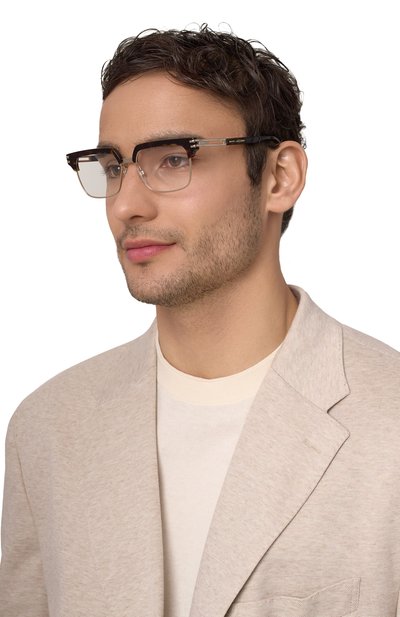Черно-золотую оправу создали, вдохновившись винтажными моделями с полуободковой конструкцией. Основу выполнили из особенно прочного, но при этом почти невесомого т итана, а характерную форму cat eye придали деталями из ацетата. Этот же глянцевый материал, быстро перенимающий тепло кожи, выбрали для дужек.